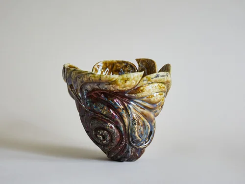 Wheel-thrown, hand-carved biomorphic vessel in raku fired white stoneware with an iridescent claret and ochre glaze. Signed: RP.