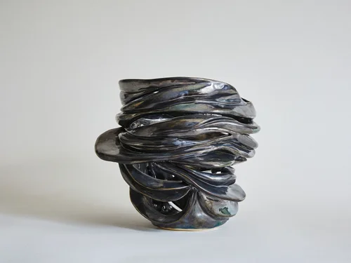 Wheel-thrown and manipulated vessel in white stoneware with steel gray glaze. Signed: RP.