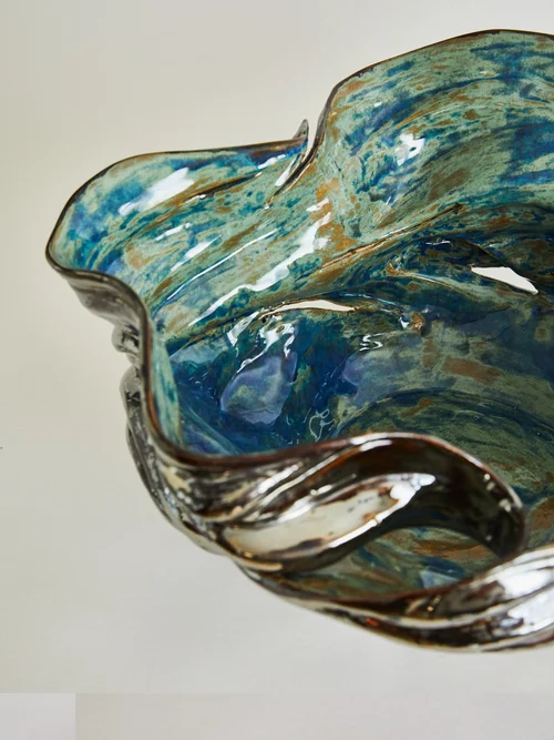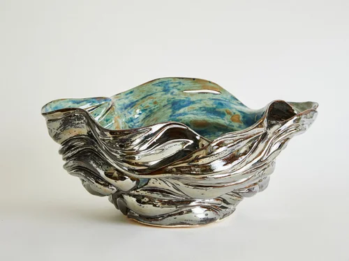 Wheel-thrown, hand-carved biomorphic vessel in glazed white stoneware with a marbled cyan interior and glossy steel exterior. Signed: RP.