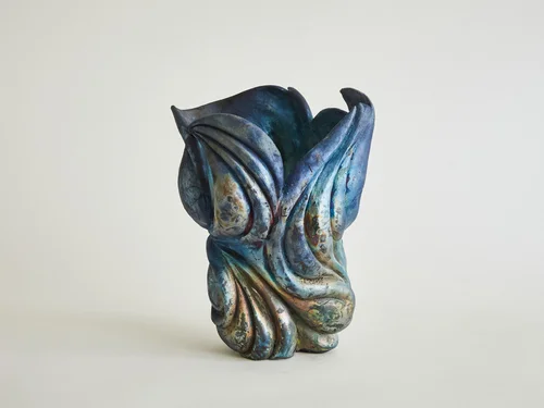 Wheel-thrown, hand-carved biomorphic vessel in raku fired white stoneware with an iridescent dark blue glaze. Signed: RP.