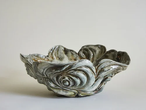 Wheel-thrown, hand-carved biomorphic vessel in white stoneware with a steel glaze. Signed: RP.