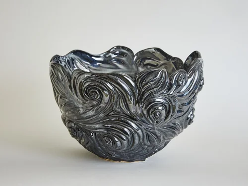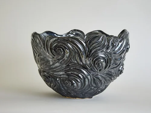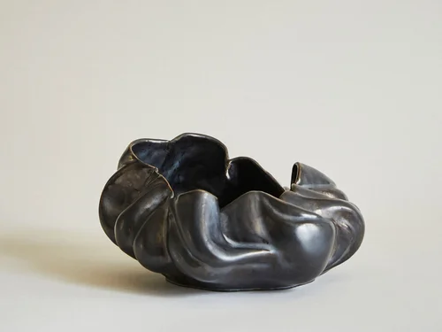 Wheel-thrown, hand-carved biomorphic vessel in white stoneware with a deco black glaze. Signed: RP.
