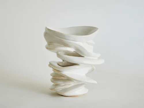 Wheel-thrown and manipulated raku vessel in white stoneware with glaze. Signed: RP.